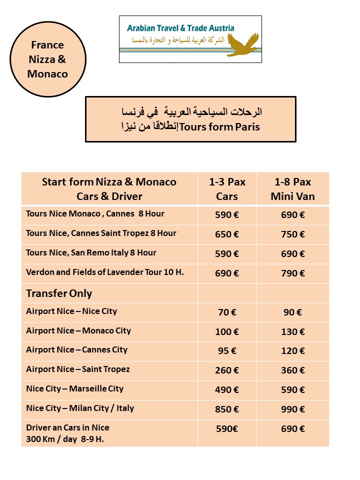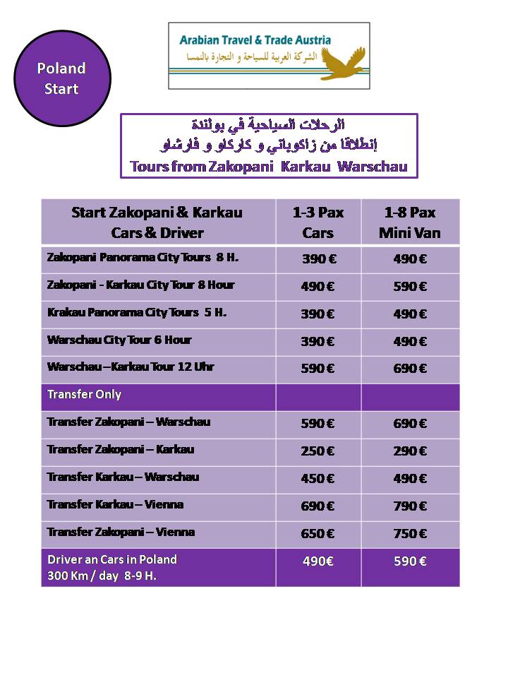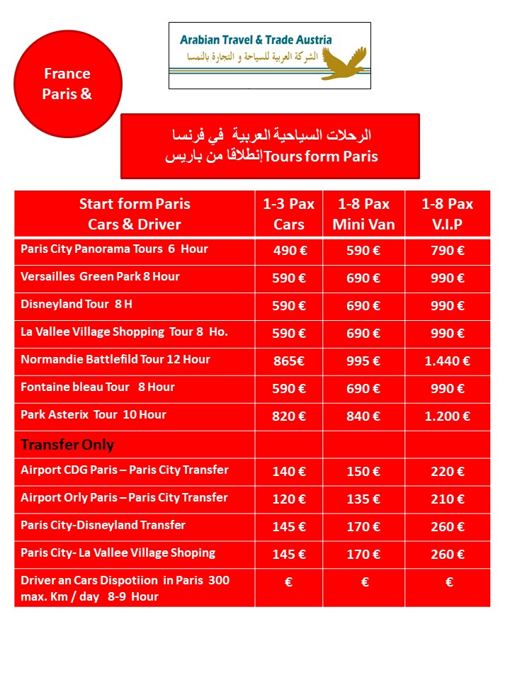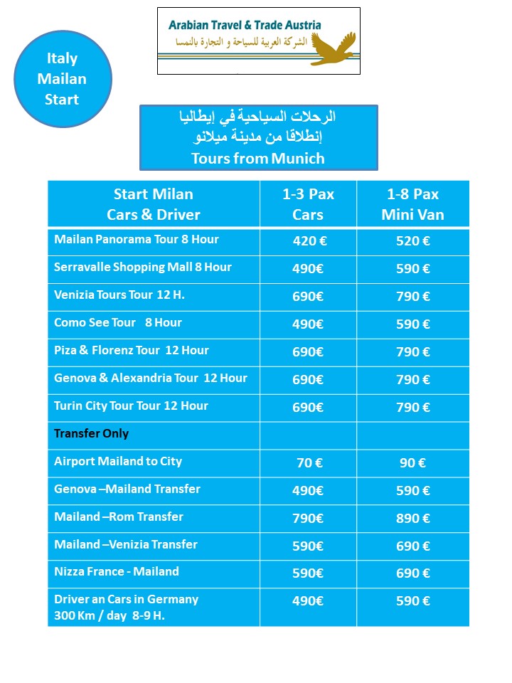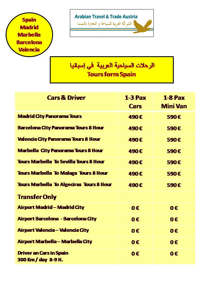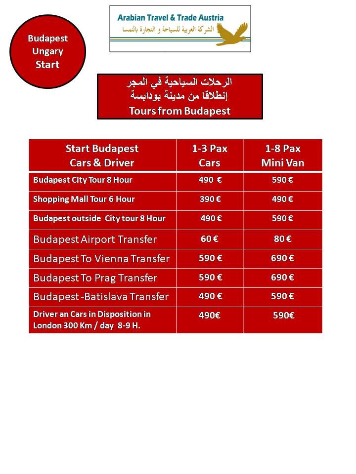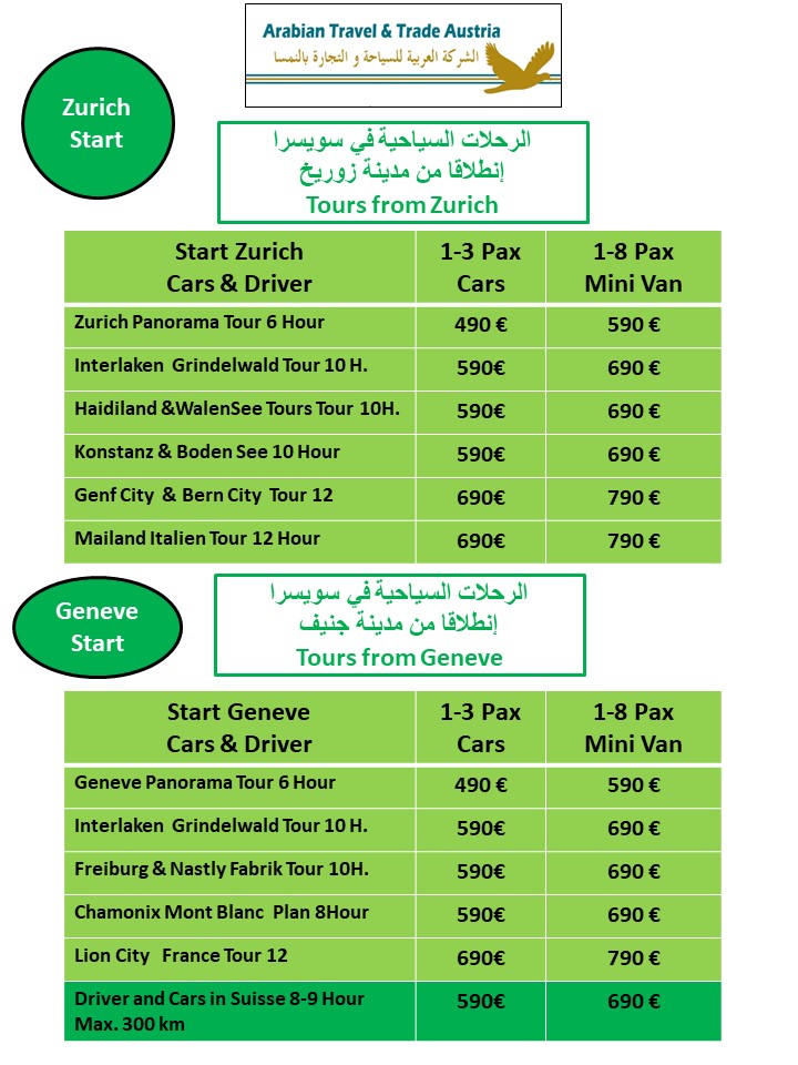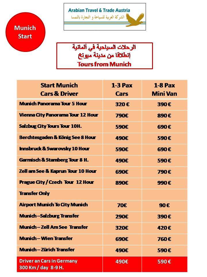 الشركة العربية بالنمسا تتعامل مع العديد منالمكاتب السياحية في العواصم الاوروبية لتنظيم الرحلات السياحية و توصيلات المطار و في مايلي قائمة الرحلات و الاسعار و ممثلي مكاتب السياحة